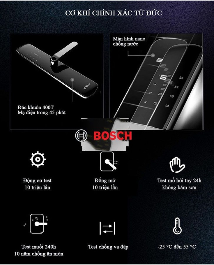 Bosch nổi tiếng toàn cầu về độ bền và sự ổn định. Khóa vân tay Bosch ID60C được kiểm định nghiêm ngặt trước khi xuất xưởng.