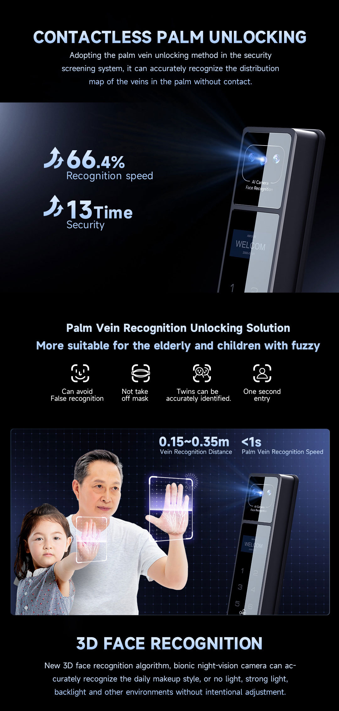 Sử dụng công nghệ AI nhận dạng khuôn mặt tiên tiến, khóa có thể nhận diện trong bóng tối, nhận đúng người dùng chỉ trong 0.3 giây và chống mở khóa bằng hình ảnh hoặc video.